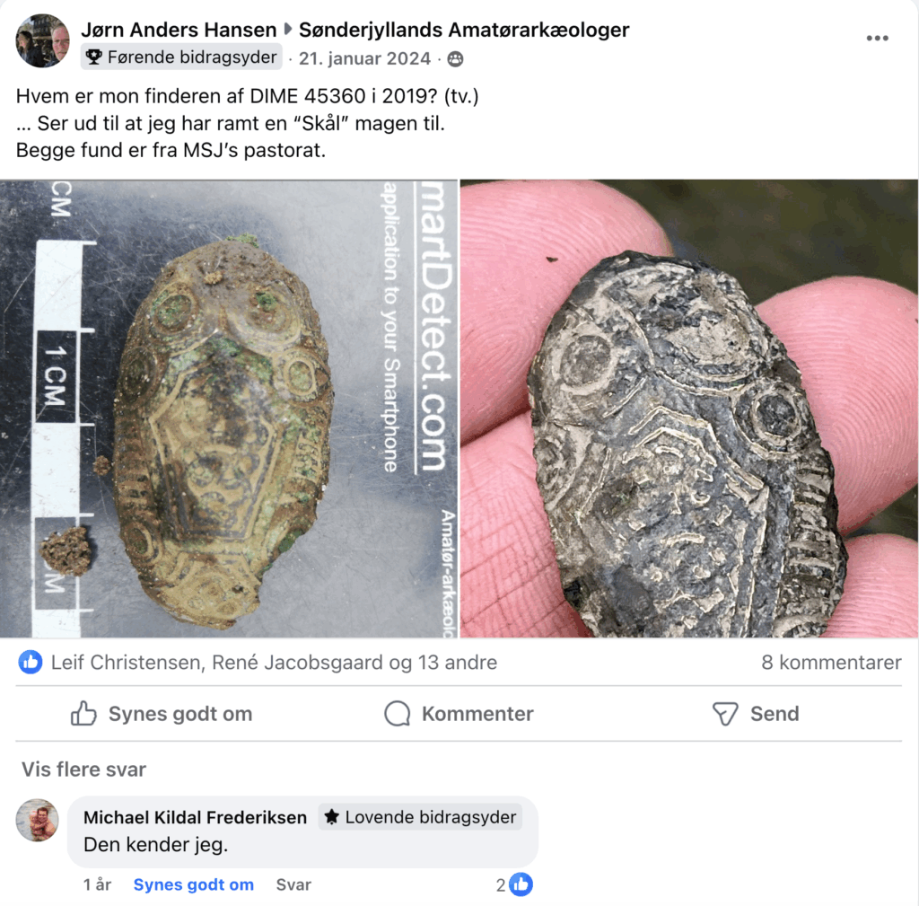 I januar 2024 fandt jeg et fragment af en lille oval skålfibel vest for Rejsby (DIME 246538). Ved et nærmere kig i DIME så jeg, at der var registreret et fund med stor lighed (DIME 45360). En efterlysning af finderen på foreningens Facebook-side afslørede, at det var Michael Kildal Frederiksen, som den 11. oktober 2019 havde fundet en næsten komplet skålfibel tæt på Vojens. Næsten fem år senere dukkede der altså endnu en op — denne gang vest for Rejsby.